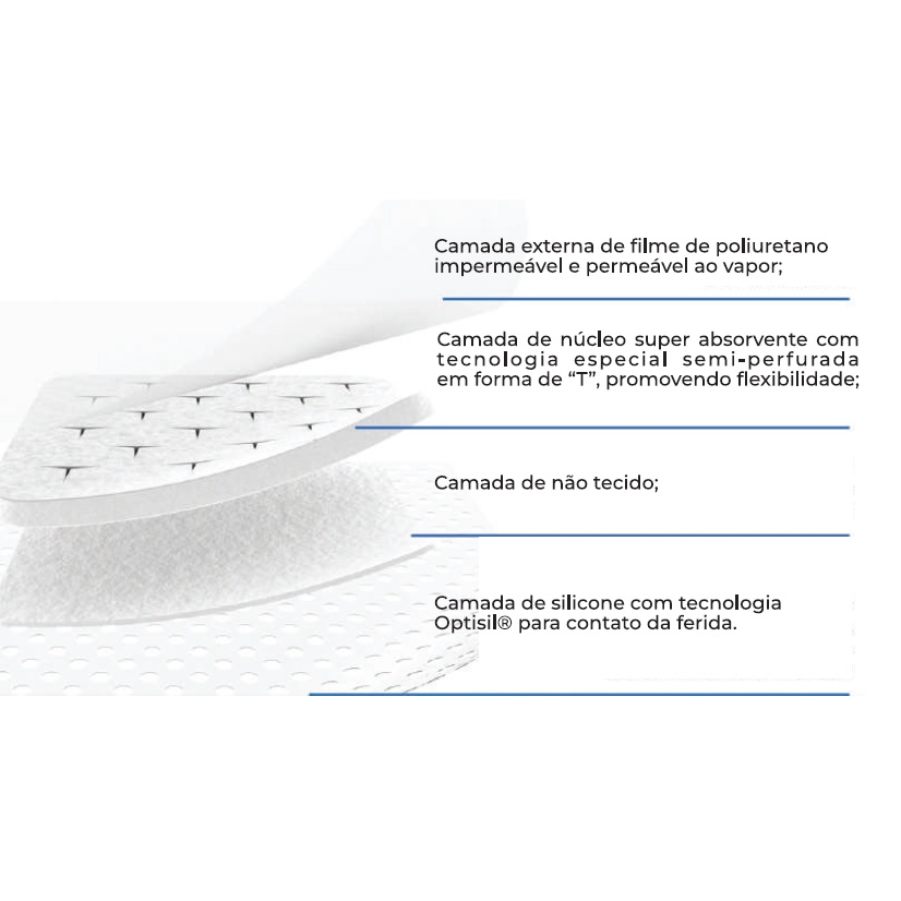 É um curativo estéril para uso em feridas exsudativas, consistindo em um filme de poliuretano impermeável e permeável ao vapor, camada absorvente de tecido não tecido e fibra de poliacrilato e camada de silicone perfurada para contato com a ferida. Ele é projetado para se moldar suavementeà pele sem grudar na ferida úmida, para que você possa removê-lo facilmente sem danificar a pele. A almofada absorvente é altamente absorvente para reduzir o risco de maceração e frequência de troca de curativo.